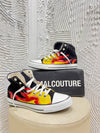 Sneakers Minimal Couture Flame , la scarpa richiama a sè il modello Converse, un must che nel tempo brilla di massimo splendore. La scarpa presenta una colorazione nera con dettagli fiammanti su entrambi i lati , con punta bianca in gomma, sinonimo di comodità e flessibilità.