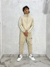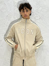 La felpa presenta un taglio regular fit con collo alto, bande nere a contrasto lungo le maniche e la stampa ICON sul petto, per un look pulito ma d'impatto. I pantaloni completano il set con un fit affusolato, laccio nero regolabile in vita e il logo ICON sulla coscia per un richiamo coerente.