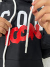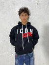 Il cappuccio è regolabile tramite laccetti bianchi personalizzati con scritta ICON, mentre la tasca a marsupio frontale aggiunge funzionalità e stile.