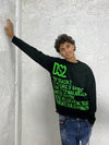La base total black viene valorizzata da cuciture a contrasto verdi e dettagli distribuiti su diverse zone del capo.
